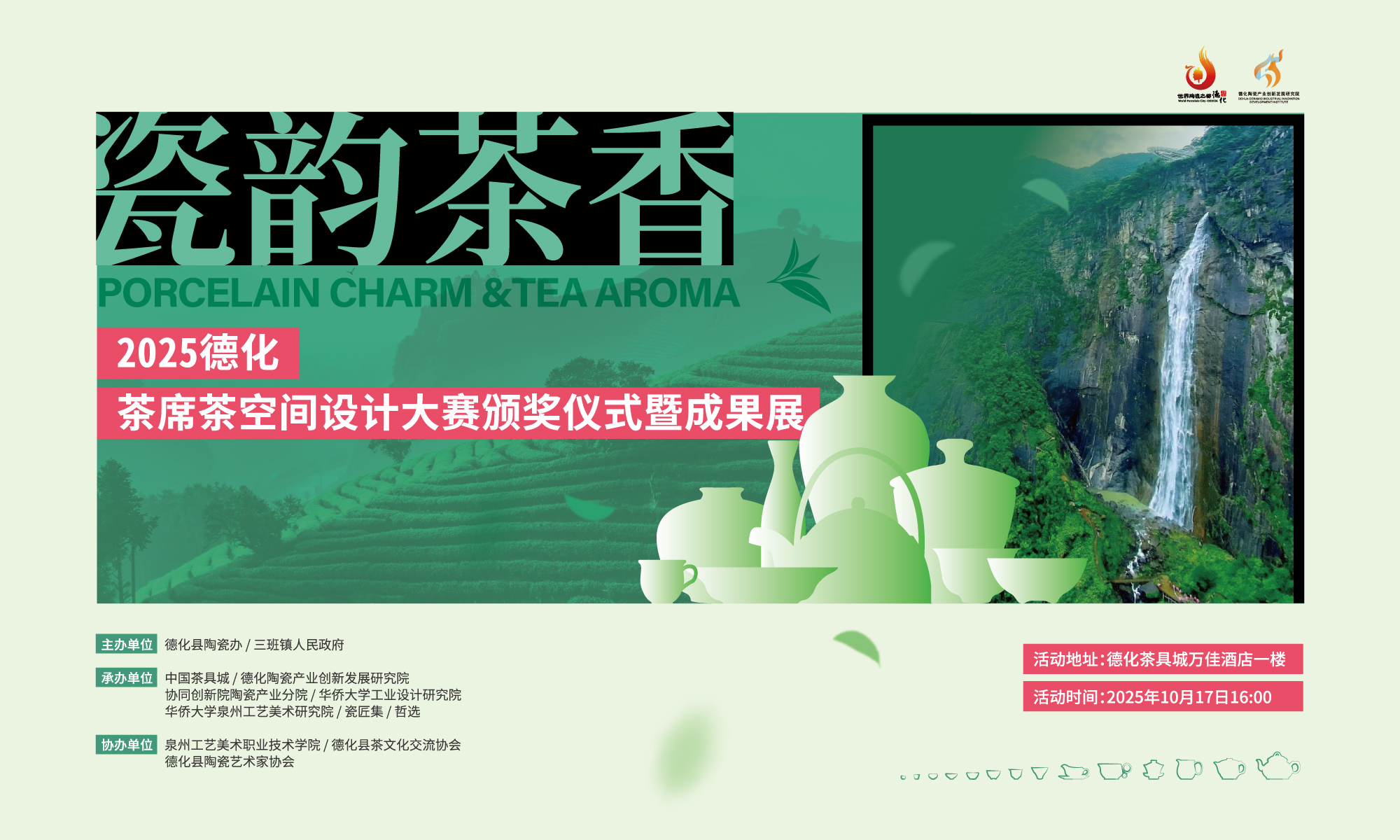 10月17日下午,2025德化茶席茶空间设计大赛颁奖仪式暨成果展在德化中国茶具城隆重举行,一场属于茶瓷融合创新设计盛会正式开启。德化县人民政府副县长林亮国,三班镇党委副书记、镇长陈为富,德化县陶瓷办常务副主任曾宪升,中国茶具城董事长郑永生,国家陶瓷行业工业设计研究院副院长唐孝康,县科技局、工信商务局、农业农村局、文旅局、市场监管局、总工会、团县委、工商联、城联社、融媒体中心、泉州工艺美院、德化职校等单位领导,以及陶瓷艺术大师、工艺美术大师、陶瓷、茶文化领域企业代表、电商企业代表、设计师,“茶席茶空间”获奖选手们齐聚一堂,共同见证一场茶瓷融合的美学盛宴 。