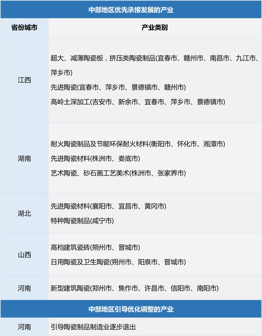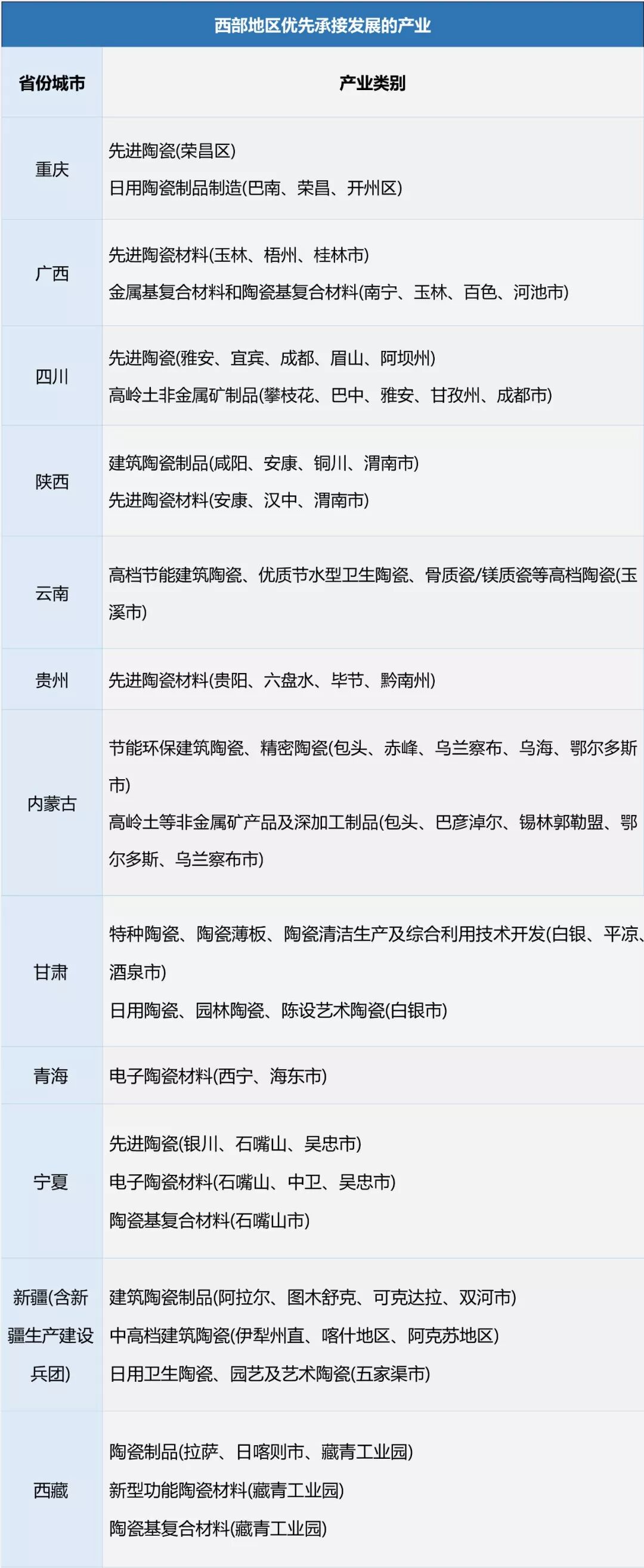 11月15日,国家工信部发布了《产业转移指导目录(2018 年版)》,该目录对全国东北、东部、中部、西部等四个区域陶瓷相关产业的优化调整提出具体导向,对未来不宜再承接的产业予以明示。