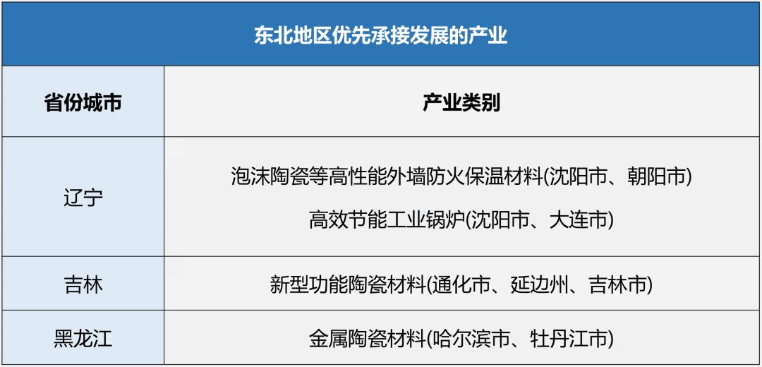 东北地区(辽宁、吉林和黑龙江三省),区位条件优越,沿边沿海优势明显。重点承接发展的产业方向有:发挥黑龙江高岭土等原材料工业资源优势、积极发展非金属矿及深加工产业。辽宁沈阳经济区(包括沈阳、鞍山、抚顺、本溪、辽阳五市以及沈抚新区)则重点发展陶瓷、家具产业。