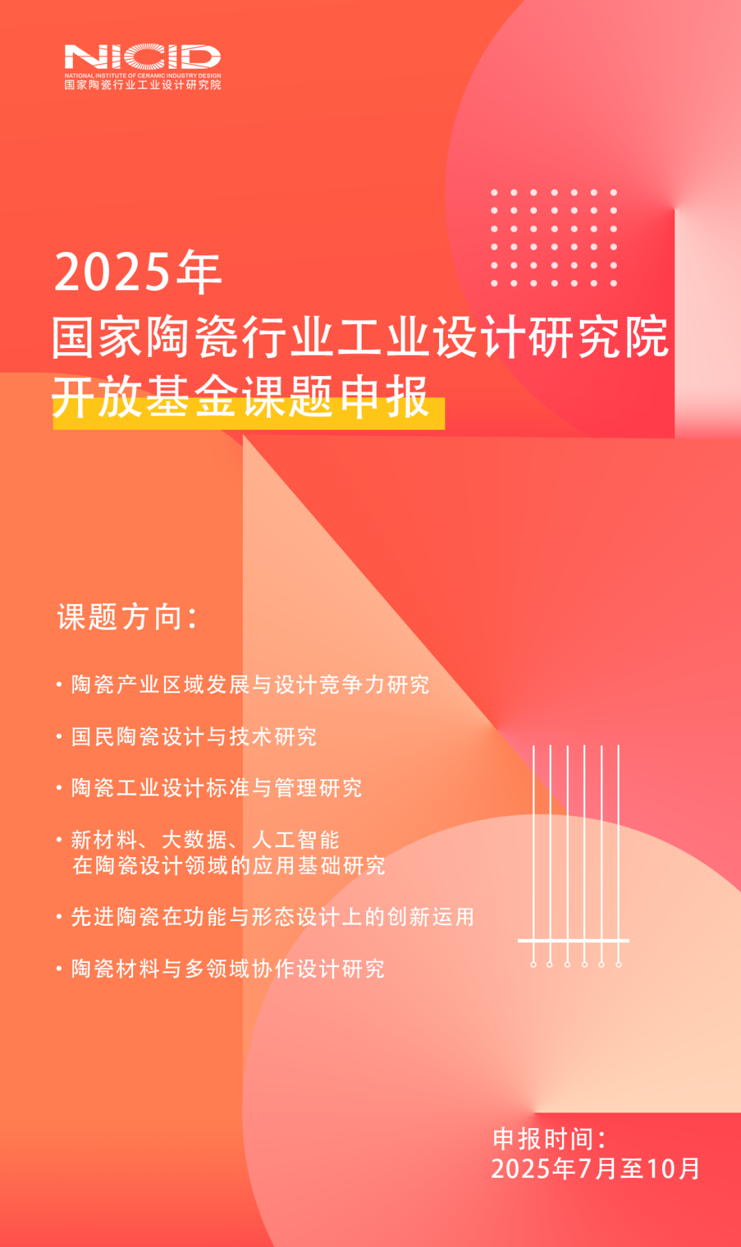 在全球科技与文化深度交融、创新驱动产业变革的时代浪潮下,陶瓷行业正面临着前所未有的机遇与挑战。为积极响应国家创新驱动发展战略,推动陶瓷产业的转型升级,国家陶瓷行业工业设计研究院发布第三期开放课题基金,旨在凝聚国内外高校、科研院所的智慧力量,以创新研究引领陶瓷产业新未来。 01 基金设立目标 1、激发前沿探索:对陶瓷行业前瞻性、基础性问题展开深度研究,催生新理论、新方法,为产业发展注入源头活水。 2、促进跨界融合:打破学科壁垒,推动陶瓷与材料科学、信息技术、艺术设计、人工智能等多领域交叉创新,构建陶瓷产业发展新生态。 3、加速成果转化:搭建产学研用协同创新桥梁,将优秀研究成果快速、高效地应用于陶瓷生产实践,提升产业核心竞争力。 02 重点资助的研究领域 开放基金主要围绕科学与艺术、大数据、人工智能、标准与管理、新材料在陶瓷产业中的研究与应用展开。 方向一:陶瓷产业区域发展与设计竞争力研究 方向二:国民陶瓷设计与技术研究 方向三:陶瓷工业设计标准与管理研究 方向四:新材料、大数据、人工智能在陶瓷设计领域的应用基础研究 方向五:先进陶瓷在功能与形态设计上的创新运用 方向六:陶瓷材料与多领域协作设计研究 除上述方向外,具有创新性或对产业发展具有重要战略意义的选题亦可参与申请。 03 资助对象要求 1.申请人需满足以下条件之一: a.在读硕士生或在读博士生,须导师推荐; b.中级专业技术职称且具有硕士学位; c.副高以上(含)专业技术职称或具有博士学位。 2.申请人无未结题开放基金项目。 3.无不良学术记录。 04 项目类型与资助金额 本次开放基金项目分一般项目和重点项目,拟支持5-8项课题。 一般项目:资助金额为人民币2-5万元/项; 重点项目:资助金额为人民币5-7万元/项。 05 有关要求 1.申请人填写《2025国家陶瓷行业工业设计研究院开放基金课题申请书》(附件2),申报材料应真实可靠、合法合规、重点突出、研究方法和技术路线合理可行,并有明确的任务计划与经费预算。申请人申请的研究内容已获得其他渠道或项目资助的,应当在申请材料中说明资助情况以及与本项目的关系和区别。 2.申请书(纸质一式两份)于2025年10月31日前报送至我院(福建德化诗泰街6号),同时将电子文档发至nicid2019@163.com,并注明“开放基金课题+申请人+课题名称”。 3.申请人与项目组成员具备实施该项目的研究能力和可靠的时间保证,并具有基本的研究条件。 4.研究院会同专家组对提交的申请材料进行评审,择优选择10-15个课题项目进入终审。 5.具体申报要求参见《2025国家陶瓷工业设计研究院开放基金课题申报指南》(附件1)及《国家陶瓷行业工业设计研究院开放基金课题管理规则》(附件3)。 联系方式 电话:郑小姐+86 15392236955 邮箱:nicid2019@163.com 地址:福建·德化县诗泰街6号